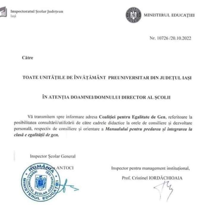 Directorii școlilor din Iași, județul unde a avut loc școala de vară pentru poponari, derulată printr-un program european, au primit o notificare de la Ministerul Educației, prin care face referire la un manual de reeducare, intitulat “Manual pentru pretarea și integrarea la clasă a egalității de gen”, pentru predarea ideologiei de gen în școli.