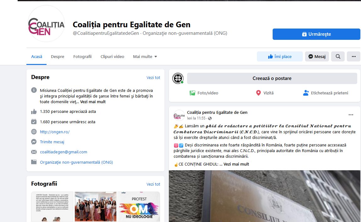 Coaliția pentru Egalitate de Gen este un ONG care a reușit să determine Ministerul Educației să le promoveze agenda gay. Aflăm că este un ONG chiar de pe pagina lor de Facebook: