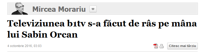 6. Mircea Morariu, în articolul antologic „Televiziunea b1tv s-a făcut de râs pe mâna lui Sabin Orcan“, publicat de adevarul.ro, în 12 iunie 2016, consemnează ceea ce nu poate fi trecut nicicum cu vederea: