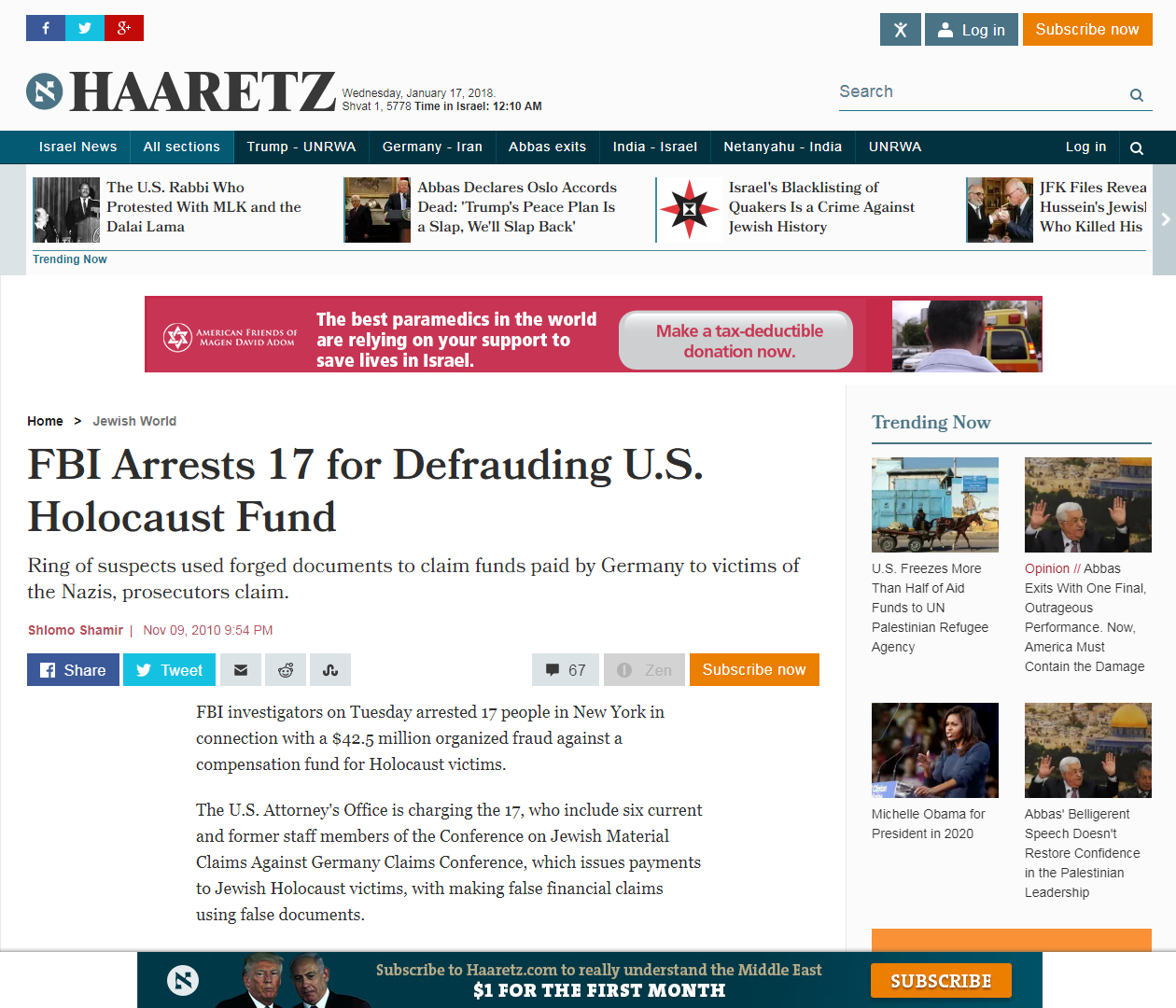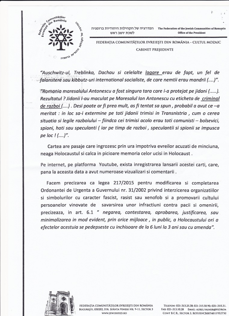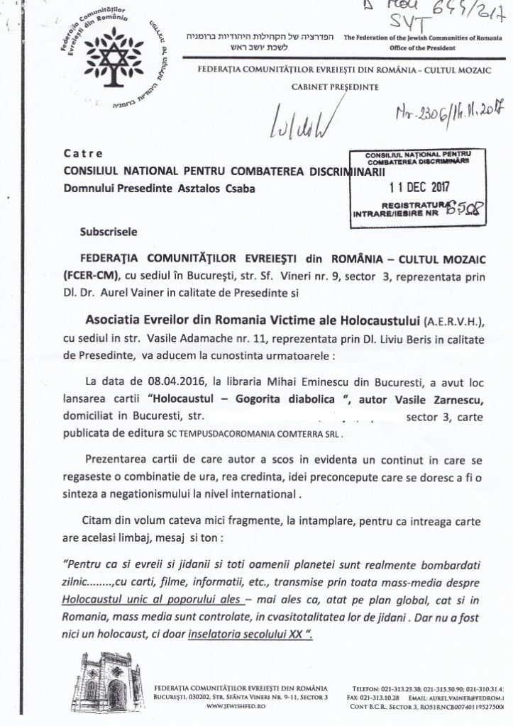 Am mai menționat într-un episod anterior[1] că impostorul Alexandru Florian, directorul infamantului institut „național“ pentru studierea holocaustului din România-„Elie Wiesel“ (I.N.S.H.R.-E.W.), care, în aprilie 2014, mi-a făcut o plîngere penală pentru niște articole publicate și, ulterior, incluse în cartea HOLOCAUSUTL – GOGORIȚA DIABOLICĂ. Extorcarea de „bani de holocaust“, vol. 1, 2015. În septembrie 2017 și-a extins plîngerea pentru a cuprinde și respectiva lucrare, precum și broșura-pamflet SABIN ORCAN $UPORT€R.