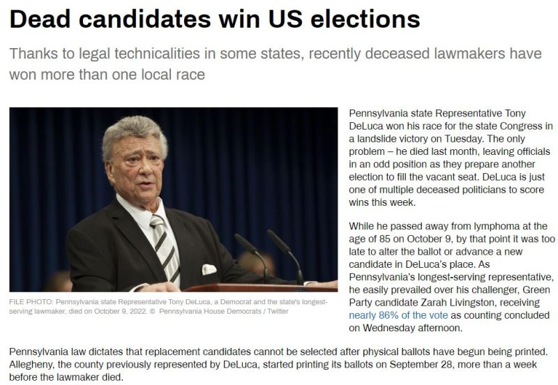 În Pensylvania a câștigat Tony deLuca, singura problemă este că acesta a murit luna trecută. Oficialii vor trebui să pregătească alte alegeri pentru a-i umple scaunul. Dar DeLuca e doar unul dintre mulți politicieni morți care au câștigat, confirmă RussiaToday.