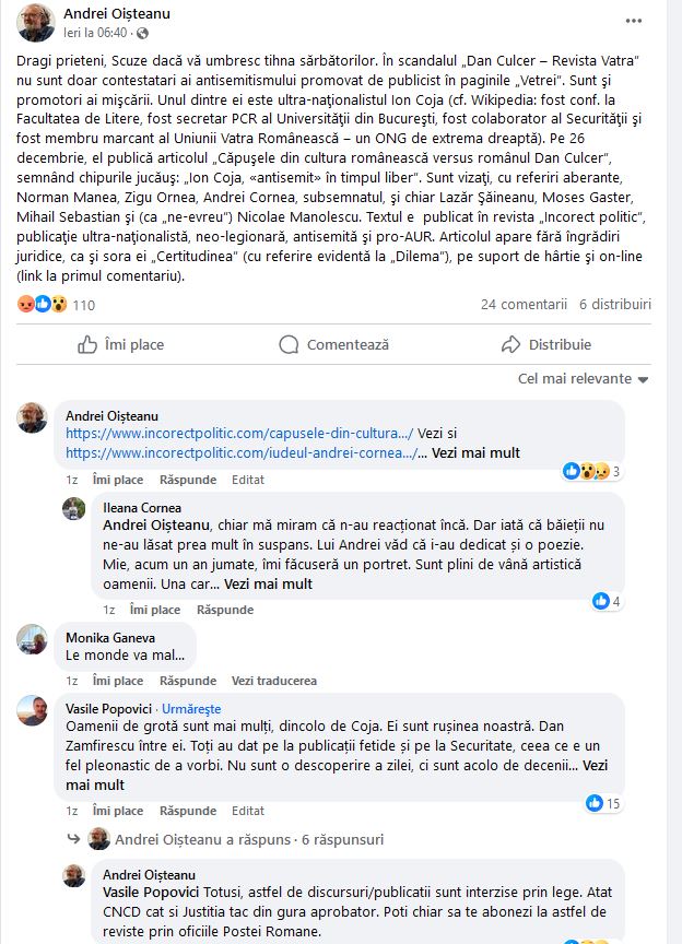 Dragi prieteni, Scuze dacă vă umbresc tihna sărbătorilor. În scandalul „Dan Culcer – Revista Vatra” nu sunt doar contestatari ai antisemitismului promovat de publicist în paginile „Vetrei”. Sunt şi promotori ai mişcării. Unul dintre ei este ultra-naţionalistul Ion Coja (cf. Wikipedia: fost conf. la Facultatea de Litere, fost secretar PCR al Universităţii din Bucureşti, fost colaborator al Securităţii şi fost membru marcant al Uniunii Vatra Românească ‒ un ONG de extrema dreaptă).