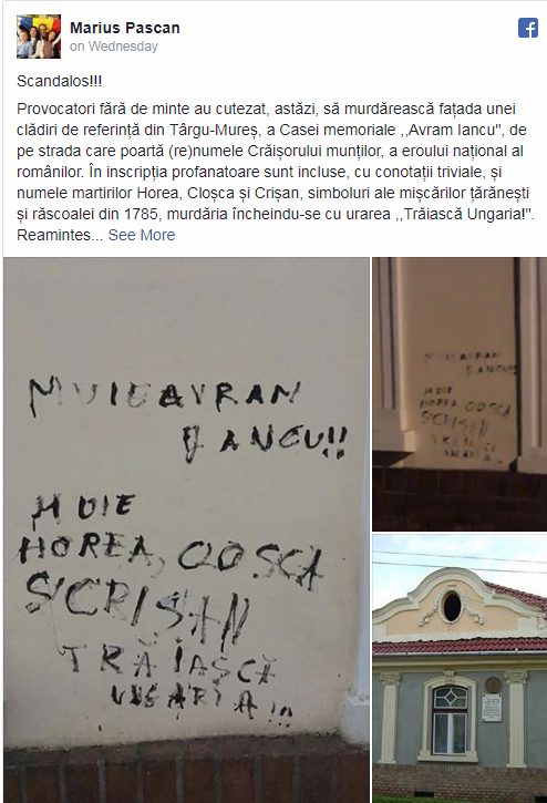 În data de 16 ianuarie anul curent au fost observate pe fațada Casei Memoriale “Avram Iancu” din Tg-Mureș, mâzgălite cu un lichid de culoare neagră, inscripțiile: “Mu*e Avram Iancu”, “Mu*e Horea, Cloșca și Crișan”, și urarea “Trăiască Ungaria!!!”. Ancheta Poliției este în desfășurare.
