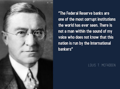 În ceea ce privește rezerva Federală, congresmanul McFadden observă: “Când a fost aprobat Legea privind rezervele federale, oamenii din aceste state nu au perceput că a fost înființat un sistem bancar mondial aici. Un super-stat controlat de bancheri internaționali și industrialiști internaționali care acționează împreună pentru a înrobi lumea pentru propria plăcere.