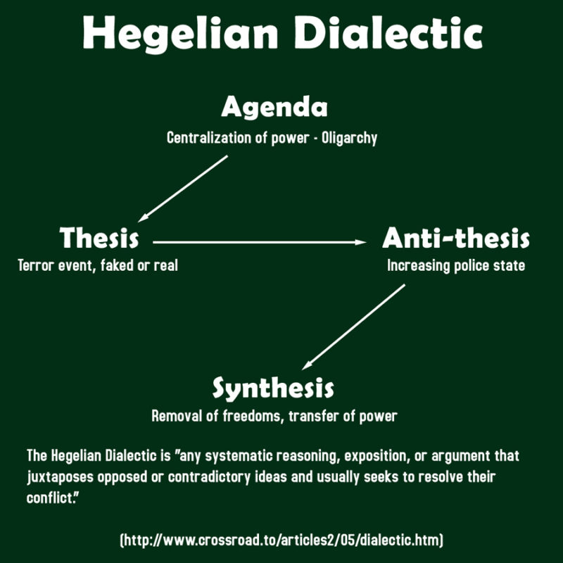 Dialectica lui Hegel este instrumentul care ne manipulează într-un model circular de gândire și acțiune. De fiecare dată când luptăm împotriva unei ideologii sau apărăm o ideologie, jucăm un rol necesar în marele plan a lui Marx și Engels pentru a conduce omenirea într-o dictatură a proletariatului.