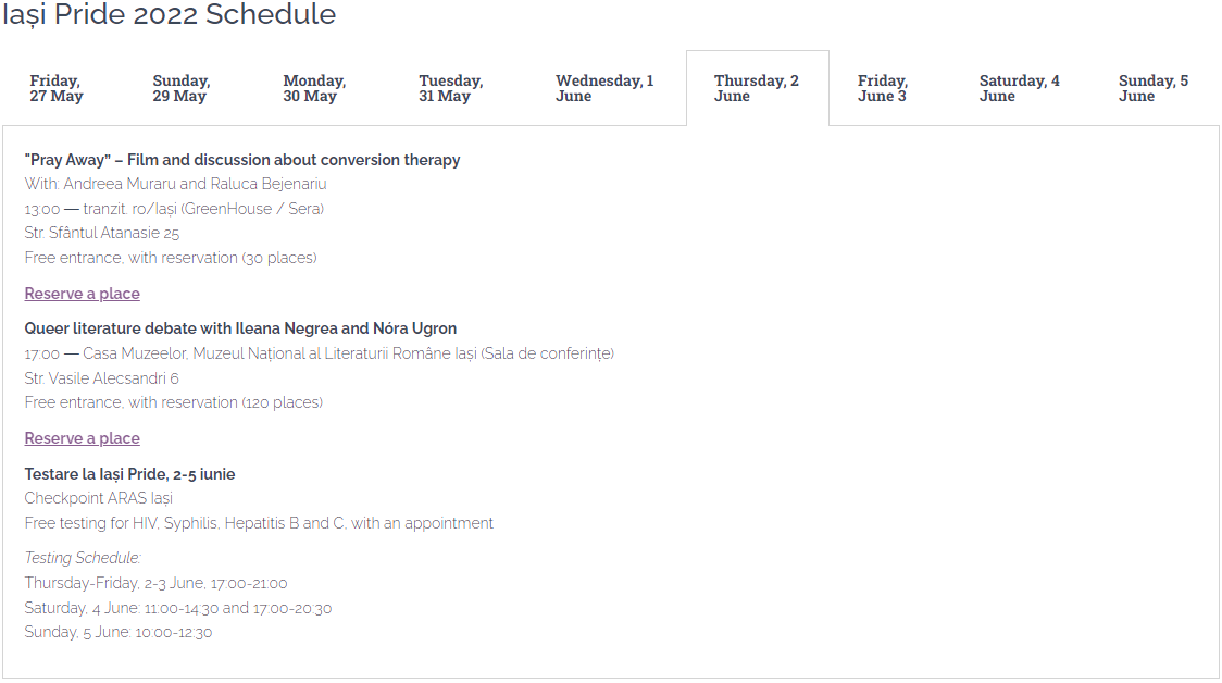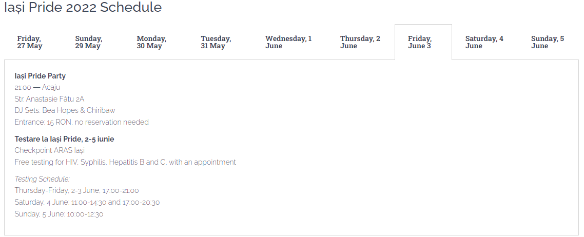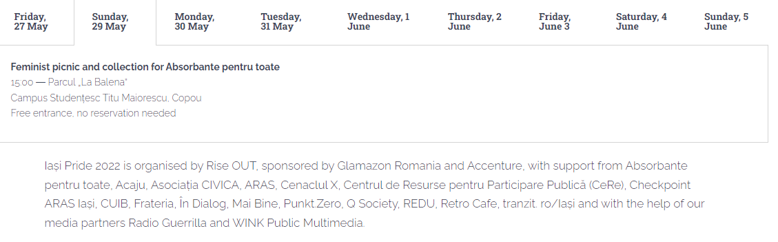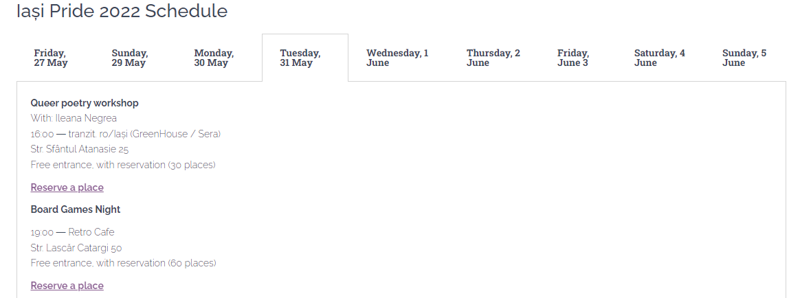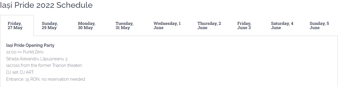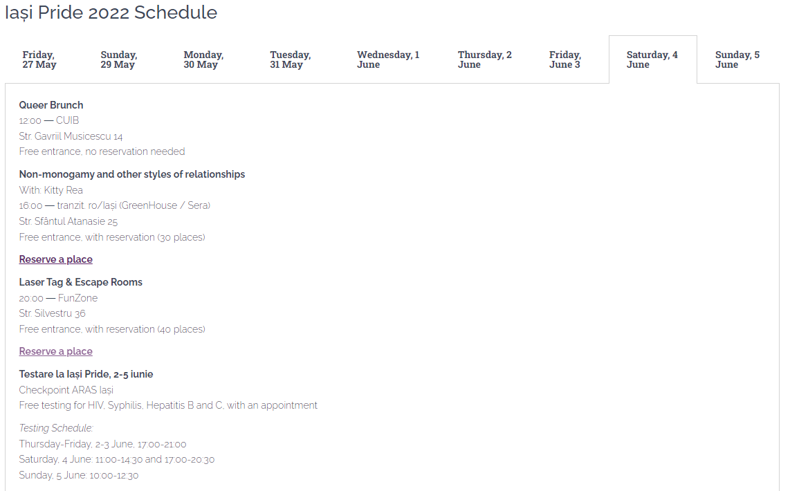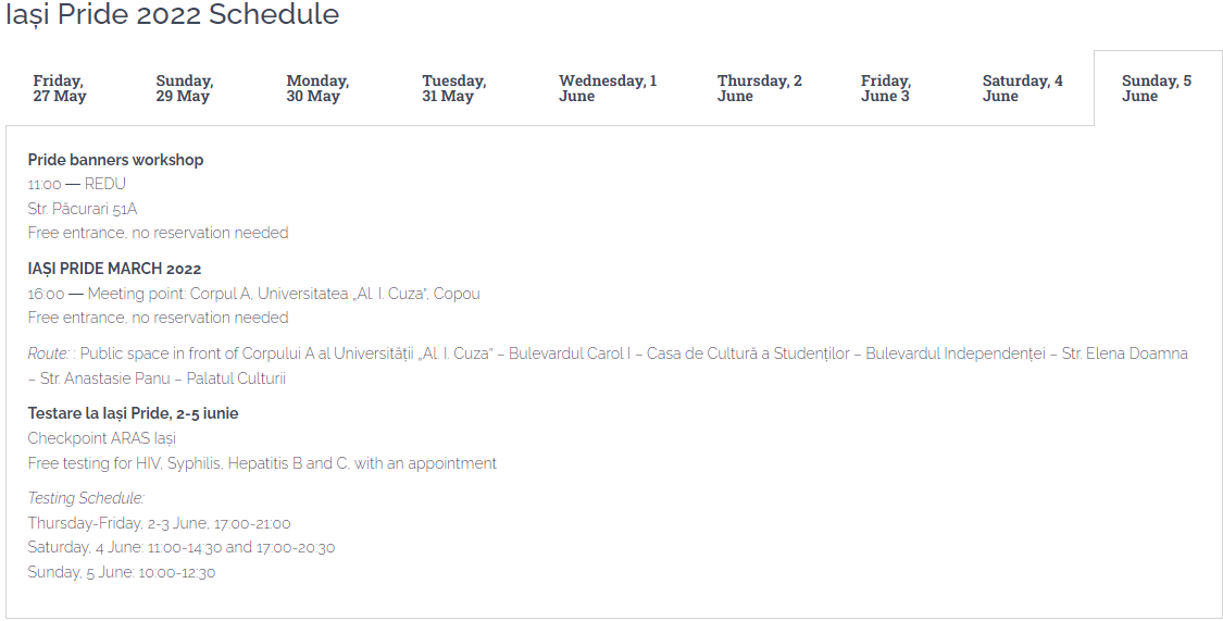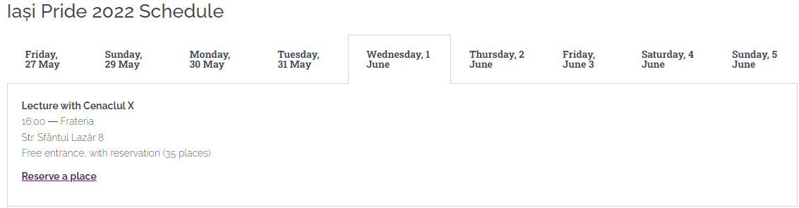 În final, în ultima zi, a noua, pe Str. Păcurari 51A va avea oc un atelier pentru confecționarea materialelor de propagandă, iar apoi vor porni în marș în cadrul paradei gay, care începe la universitatea Al. I. Cuza.
