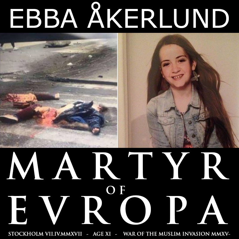 Pe una dintre arme poate fi observat numele Ebba Akerlund, o fetiță zdrobită intenționat și dezmembrată cu mașina de un musulman (cultural) la Stockholm.
