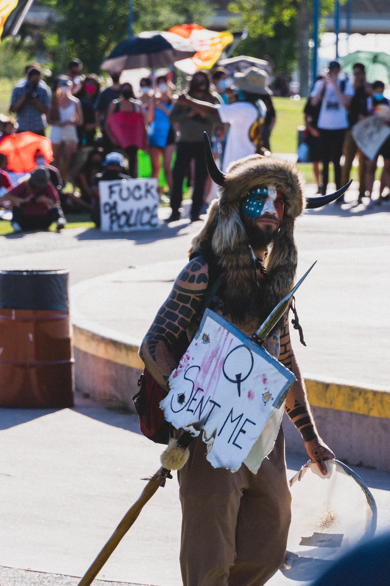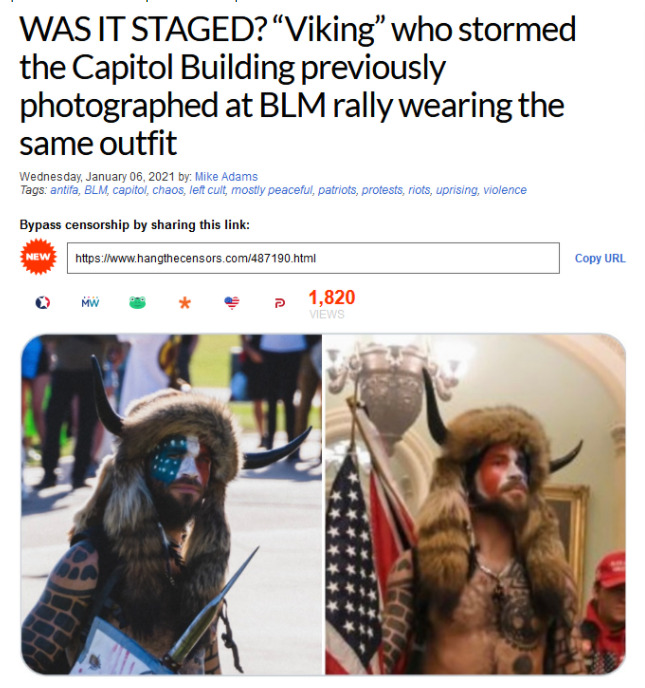 ActiveNews, fiți mai atenți, tipul ăsta era într-adevăr la un miting BLM, dar era suporter Trump și acolo. Dacă lărgiți imaginea vedeți că era un Qanon. Indiferent de legitimitatea mișcării Q, care ar merita un articol în sine, acest individ era limpede pro-Trump.