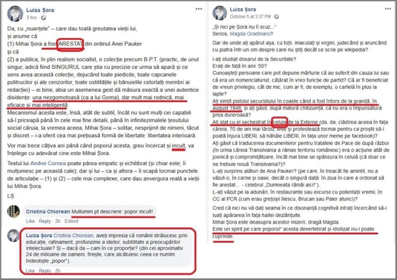 Colac peste pupăză, în apărarea lui Mihai Şora a sărit şi Luiza Palanciuc ŞORA, cea care, în 2014, desigur, din dragoste, a devenit soţia sa, cînd filosoful împlinea 94 de ani. Tot pe Facebook, Luiza Şora, într-un mod lamentabil şi obraznic, crede şi ea că cuvîntul (sic!) ei are greutatea necesară pentru a acoperi apropierea lui Mihai Şora de Ana Pauker. Palanciuca nu se limitează însă la apărarea firească a soţului său, ci adresează jigniri grosolane la adresa poporului român, scriind: „Vor mai trece cîţiva ani pînă cînd poporul acesta, greu încercat şi incult, va înţelege cu adevărat cine este Mihai Şora”! Într-o altă postare, tot Palanciuca mai scrie: „Este un spirit pe care POPORUL ACESTA DEVERTEBRAT ŞI IDIOTIZAT nu-l poate cuprinde”! Ia, citiţi: