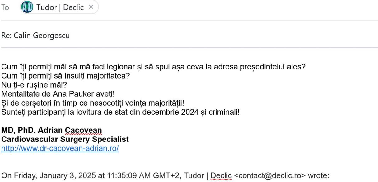Ce email a primit doctorul Adrian Cacovean de la Declic: