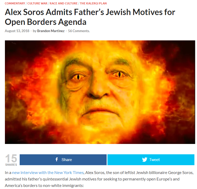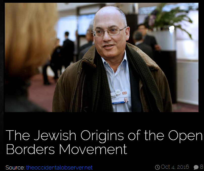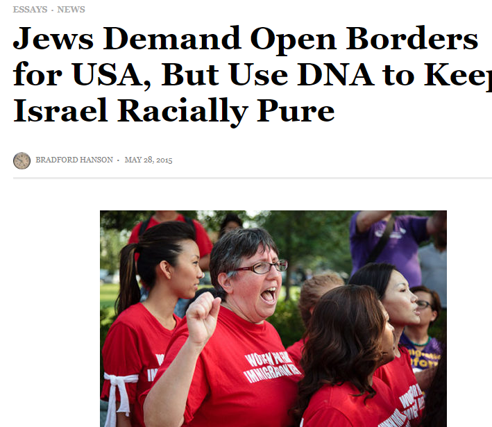 „Evreii din America sunt 100% uniți în a cere „frontiere deschise” și „legi relaxate pentru imigrație ” – dar în același timp susțin în mod ipocrit Israelul, care acum folosește teste DNA ca să mențină statul evreiesc pur din punct de vedere rasial. ”