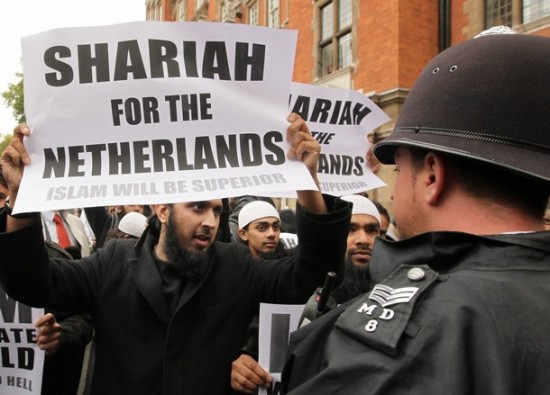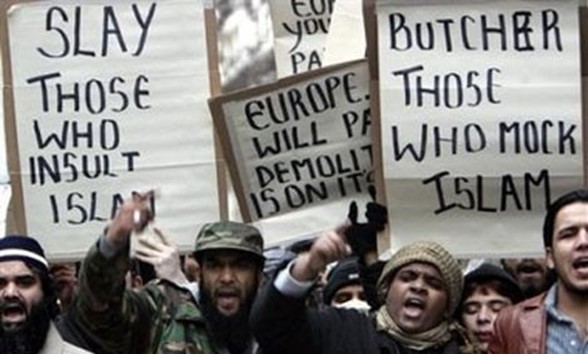 Pe pancarde: „Omoară pe cei care insultă Islamul. Măcelărește pe cei care fac mișto de Islam”.