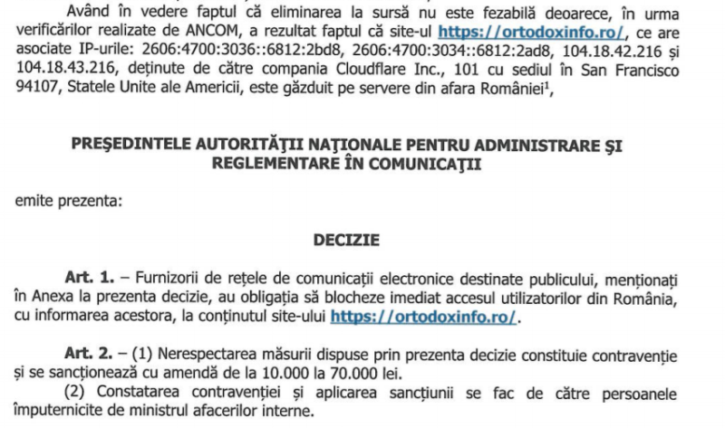 Până acum site-urile cenzurate au căzut din cauza firmelor de găzduire, care au cedat, amenințate fiind cu amenzi de sute de milioane. Firma care găzduiește Ortodoxinfo.ro nu a cedat, astfel s-a creat un precedent periculos. ANCOM a amenințat furnizorii de internet (RCS/RDS, Telekom, etc.) cu aceleași amenzi, obligându-le să blocheze accesul utilizatorilor din România la ortodoxinfo.