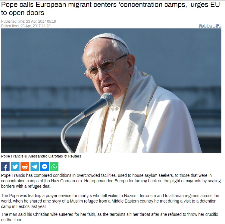 Francis a declarat că centrele de refugiați sunt ca niște tabere de concentrare (cu referire la taberele de concentrare naziste).