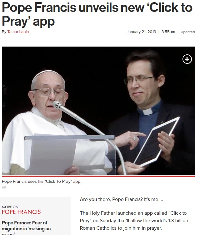 Papa anunță crearea unei aplicații pentru telefoanele mobile *Apasă ca să te rogi*. Această aplicație reprezintă agenda luciferică. (am scris în articolul despre controlul minții ce se poate face prin semnalele telefoanelor mobile și cu ajutorul aplicațiilor pe telefon)