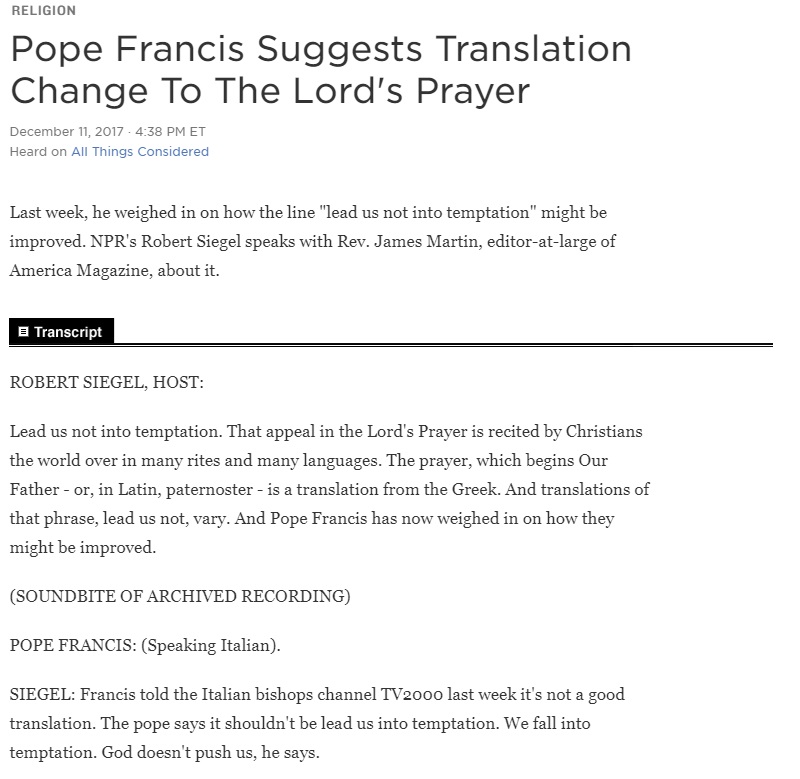 Pledează pentru schimbarea traducerii rugăciunii *Tatăl nostru* deoarece nu Dumnezeu ne duce pe noi în ispită.. ci ne ducem singuri.