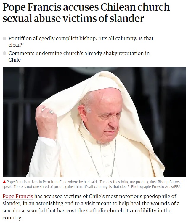 Pontiful a acuzat de calomnie victimele unui preot parohial pedofil chilian (Fernando Karadima), care a îmbolnăvit de SIDA peste 30 de copii. Faptele sale au fost ascunse de către Biserica Catolică, Vaticanul pedepsindu-l la o viață de căință și rugăciune.