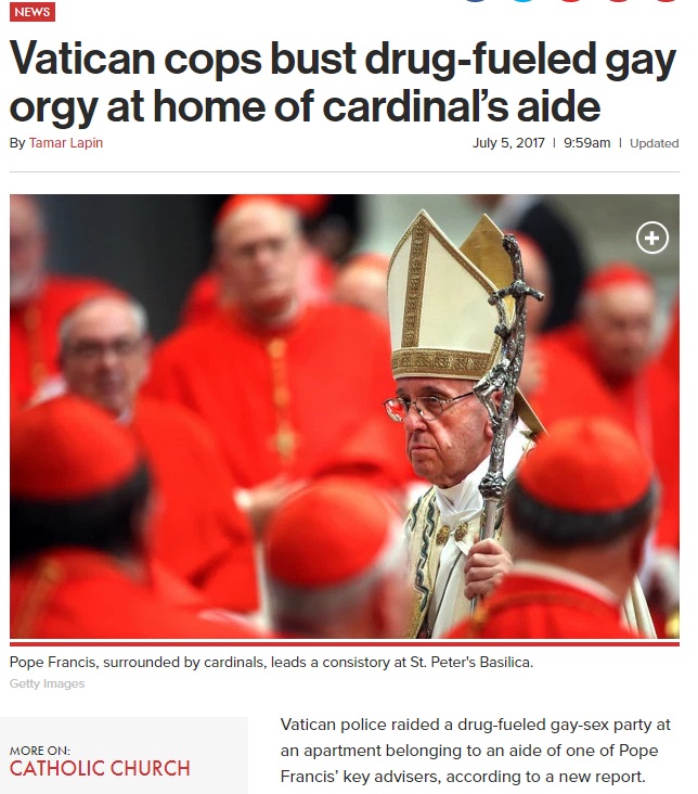 Și încă un scandal sexual de proporții lovește Vaticanul. Poliția din Vatican intervine la una din locuințele unuia dintre ajutoarele Papei Francis, unde se zvonea că se consumau droguri și se practicau orgii. În timpul intervenției avea loc o orgie homosexuală și locuința era plină de cocaină.