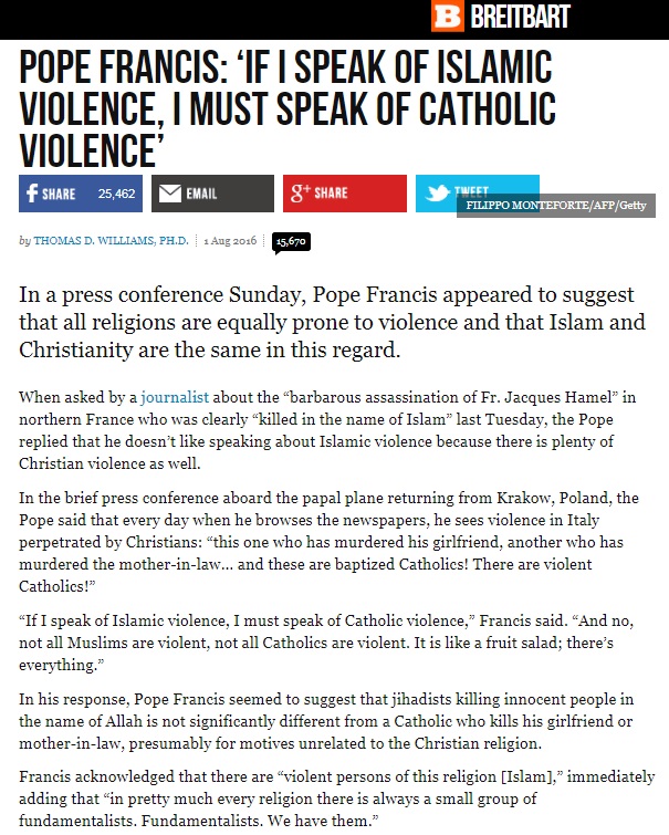Papa Francis a fost întrebat cum comentează asasinarea lui Jaques Hamel, în Franța, asasinare în numele islamului, de către fundamentaliști islamici, așa că a evitat un răspuns direct, spunând că există destulă violență creștină de asemena, și a dat câteva exemple aleatorii din Italia unde un bărbat își omorâse soția, altul soacra.