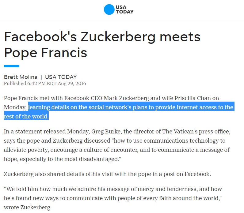 Papa s-a întâlnit, la Vatican, cu Mark Zuckerberg și soția acestuia, Priscilla Chan și au discutat despre planul a a asigura conexiune la internet întregii planete. Desigur aceasta se află pe lista de ordine a Agendei 21 a ONU.