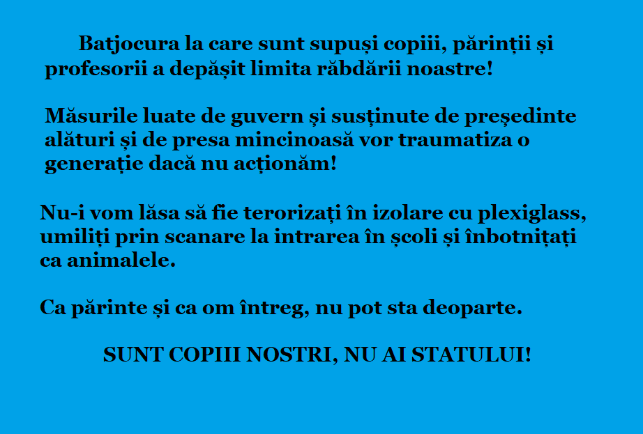 Unii părinți consideră că nu-și pot lăsa copiii terorizați în izolare cu plexiglass, umiliți prin scanare la intrarea în școli și înbotnițați ca animalele. Măsurile sunt descrise ca fiind instrumente de teroare psihică și chiar așa este. Ca părinte, cum poți sta deoparte? Ca elev, cum să te conformezi circului la care ești supus?