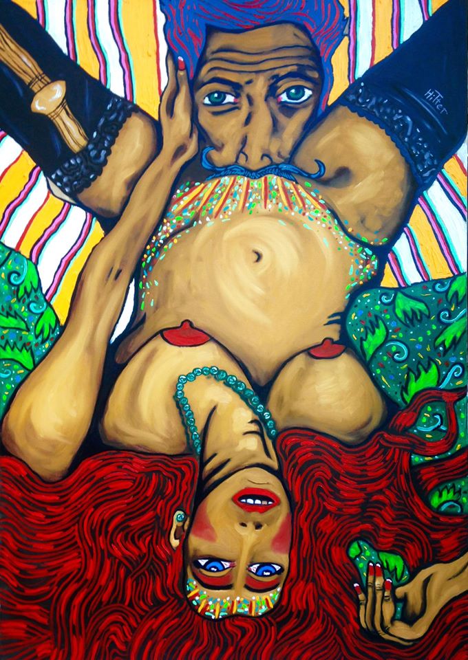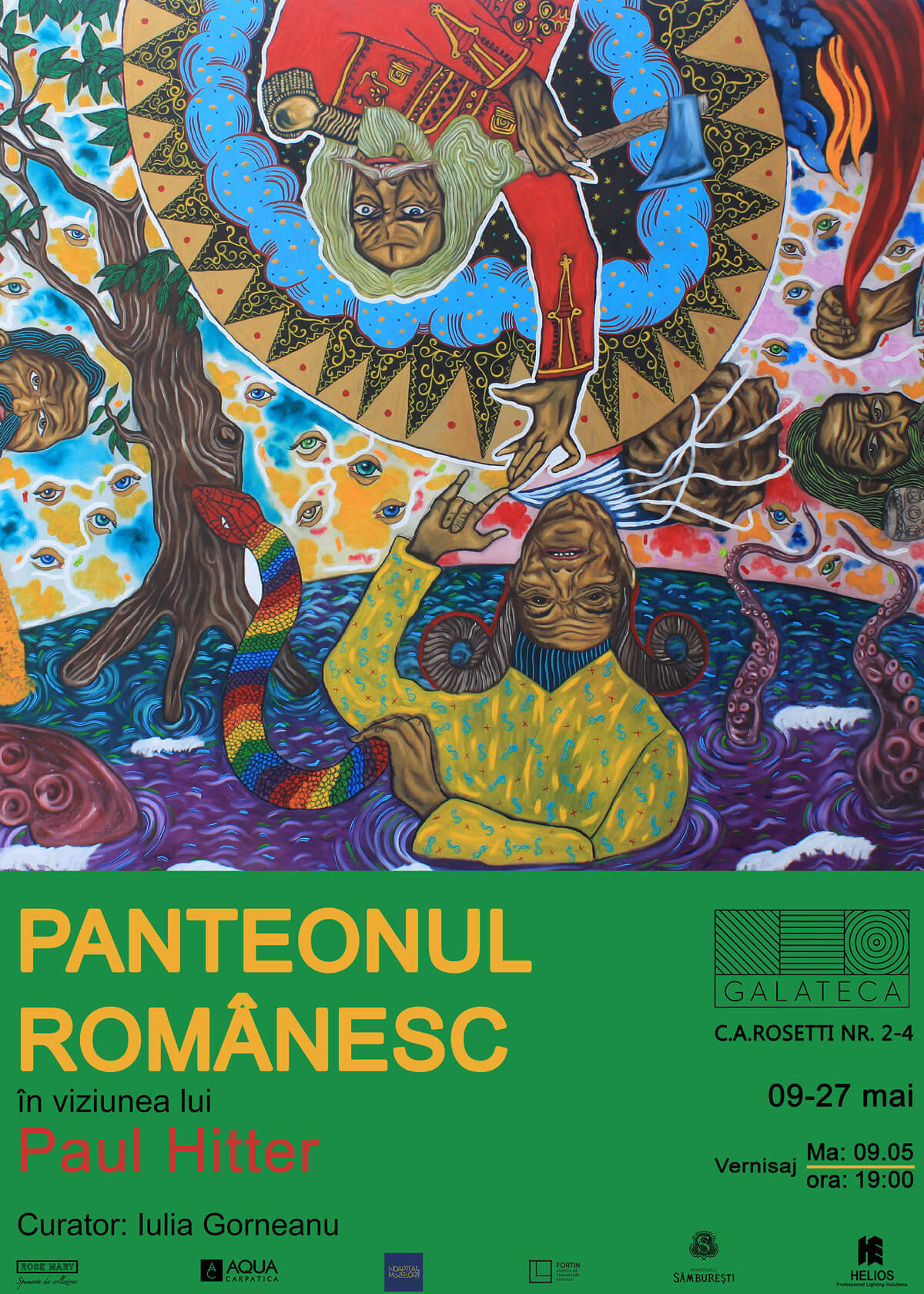 Lucrarea centrală-Cosmogonia-un axis mundi al expoziţiei, încântă privitorul printr-o compoziţie excepţională, o paralelă de la începutul timpurilor către zilele noastre, o trimitere de la haosul primordial, către haosul contemporan, artistul reuşind să treacă nemurdărit prin teme tabu, reprezentate în această uriaşă pânză: astfel, sub chipul diavolului îl recunoaştem pe George Soros, în mâna lui, Şarpele primordial fiind pictat în culorile LGBT.Oy vey…Hitter îl pictează pe Soros ca pe diavol și pe LGBT ca pe șarpele primordial?