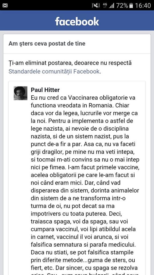 „Cenzura din nou!!!! Am scris doar ceva impotriva vaccinului.atat. mi-au sters postarea deoarece ….deoarece ce? Ce standarde nu respecta???”, a scris Paul Hitter pe pagina sa de Facebook.
