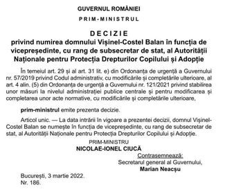 Astfel, pe 3 martie, premierul Nicolae Ciucă îl numea în funcția de vicepreședinte, cu rang de secretar de stat al Autorității Naționale pentru Protecția Copiilor și Adopție(ANPCA) pe Vișinel Costel Bălan.