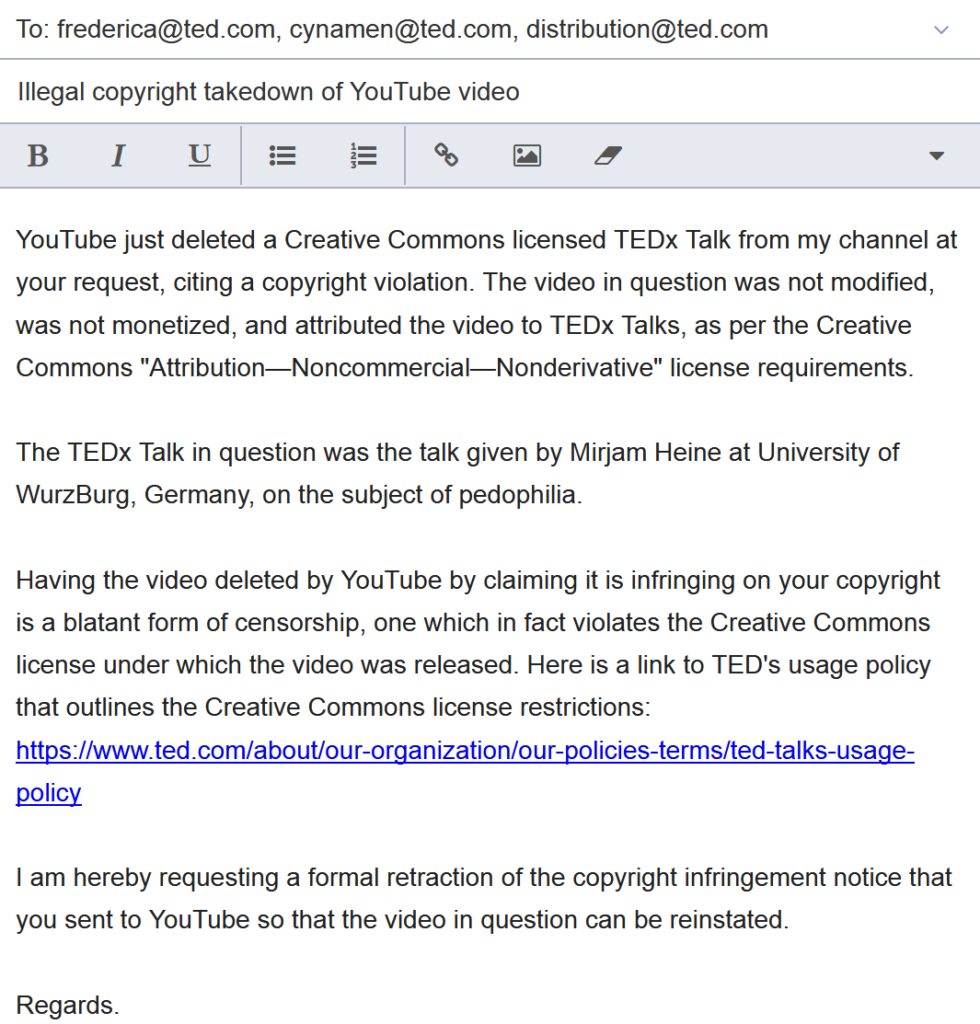 Dispariția clipului este un semn clar de cenzură, iar ștergerea sa la cererea reprezentanților TED reprezintă o încercare de mușamalizare a discursului pro-pedofilie. E timpul să dezlănțuim Efectul Streisand și să dăm dovezi la lume că TED contribuie la normalizarea pedofiliei, reclasificând-o ca o “orientare sexuală naturală”.