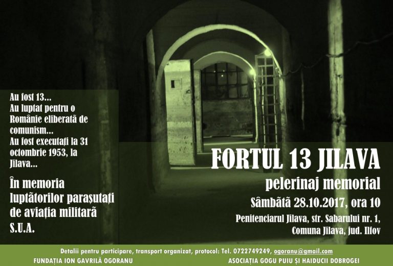 Anualul pelerinaj memorial dedicat luptătorilor anticomunişti paraşutaţi de aviaţia militară SUA, va avea loc sâmbătă 28 octombrie 2017, ora 10, la Fortul 13 Jilava (Penitenciarul Jilava, str. Sabarului nr. 1, Comuna Jilava, jud. Ilfov), în organizarea Fundaţiei Ion Gavrilă Ogoranu.