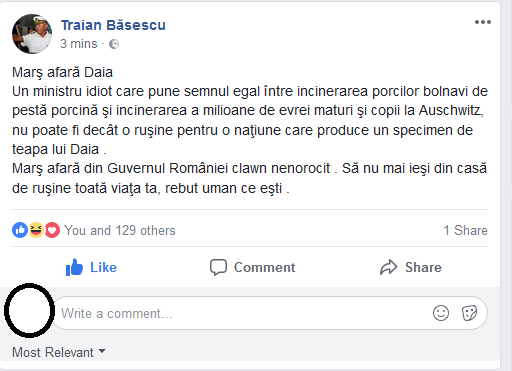 „Am vazut acum cateva minute afirmatia total gresita si de neinteles a domnului Petre Daea – ministrul agriculturii si dezvoltarii rurale, prin care a comparat situatia dintr-o ferma cu cea care a existat in lagarul de exterminare de la Auschwitz-Birkenau.