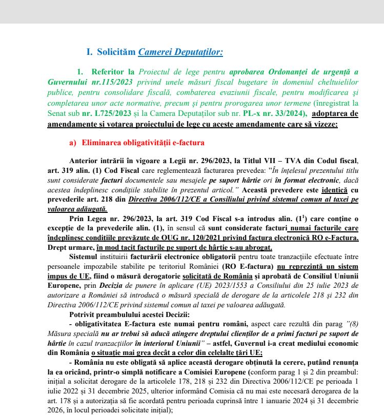 PETIȚIE! Eliminarea obligativității e-factură și abrogarea normelor care interzic efectuarea cu numerar a operațiunilor de încasări și plăți