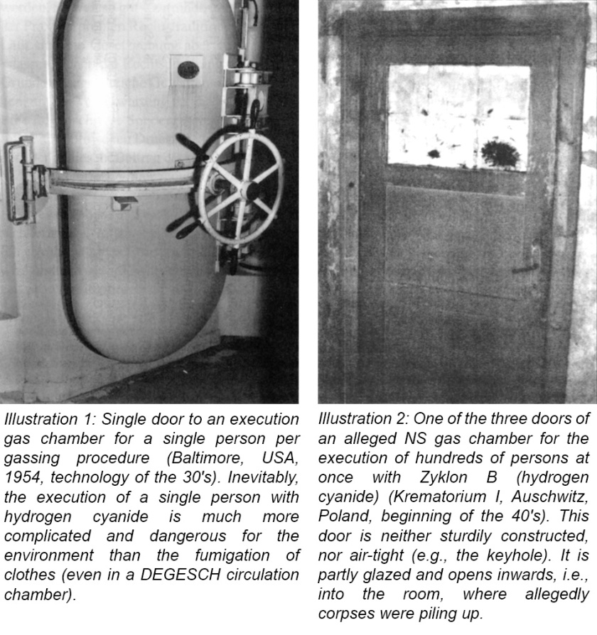 Total diferite față de presupusele camere de gazare din Germania, cu ușă de lemn, mâner pe dinăuntru si fereastră în încăpere. Dacă-s receptivi, se poate continua, explicând faptul că o construcție atât de complexă precum camerele de gazare au un manual gros de instrucțiuni. Când nemții s-au retras, aliații au capturat tone de documente, dar nu au găsit nici o referință scrisă la camere de gazare.