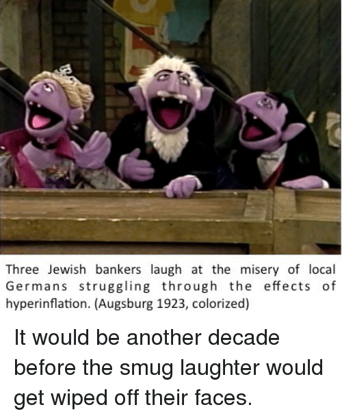 Trei bancheri evrei râd de nefericirea germanilor care o duc foarte greu din cauza hiperinflației (Augsburg 1923, poză colorizata)