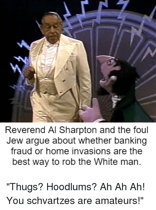 Reverendul Al Sharpton și un evreu diabolic dezbat dacă frauda bancară sau violarea de domiciliu e cel mai bun mod de a jefui populația albă.