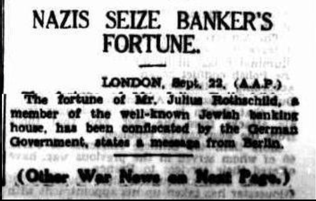 Averea lui Julius Rotschild, membru al familiei evreiești de bancheri, a fost confiscată de guvernul german, aflăm dintr-un mesaj primit din Berlin.