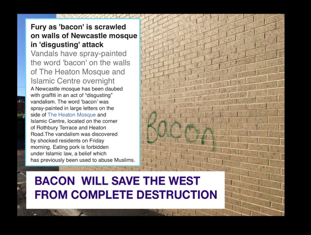 Ziarele declară că faptul de a scrie cuvântul bacon (șunculiță) pe o moschee e cel mai scandalos lucru posibil.