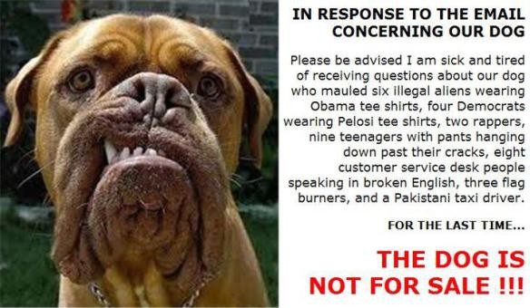 Vă rog să înțelegeți că m-am săturat până peste cap să primesc întrebări în legătură cu câinele meu care a mușcat șase imigranți ilegali ce purtau tricouri cu Obama, patru democrați ce purtau tricouri cu Hillary, doi rapperi, nouă adolescenți cu pantalonii lăsați, opt persoane de la relații cu clienții care vorbesc o engleză stricată și un șofer de taxi pakistanez.