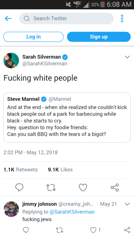 Doar folosește aceste expresii “dragi albi, noi albii privilegiați” în conversație. Apoi atacă albii, rasismul, folosește expresiile “sclavie”, “homosexualitate”, “antisemitism”, “6 milioane”.