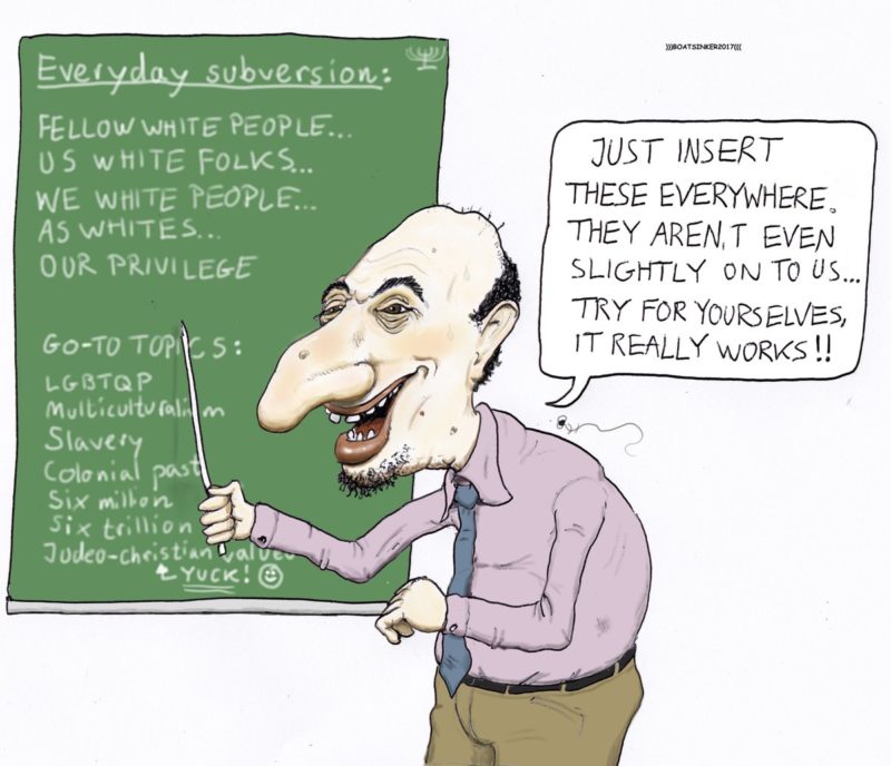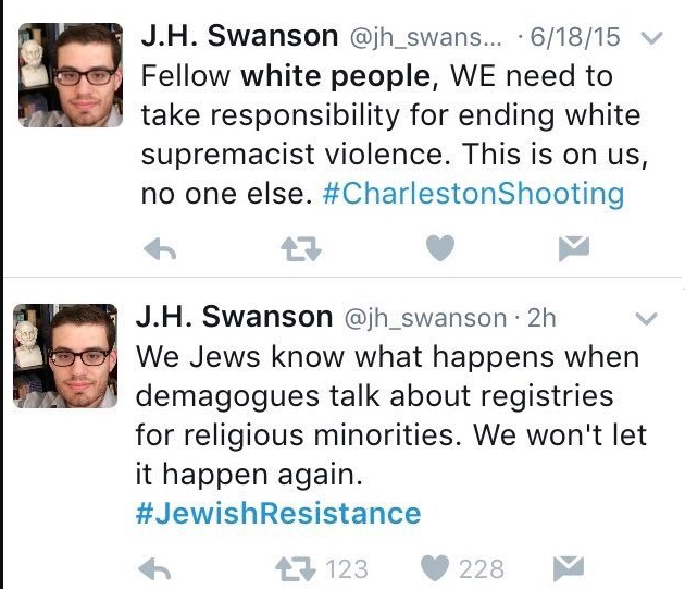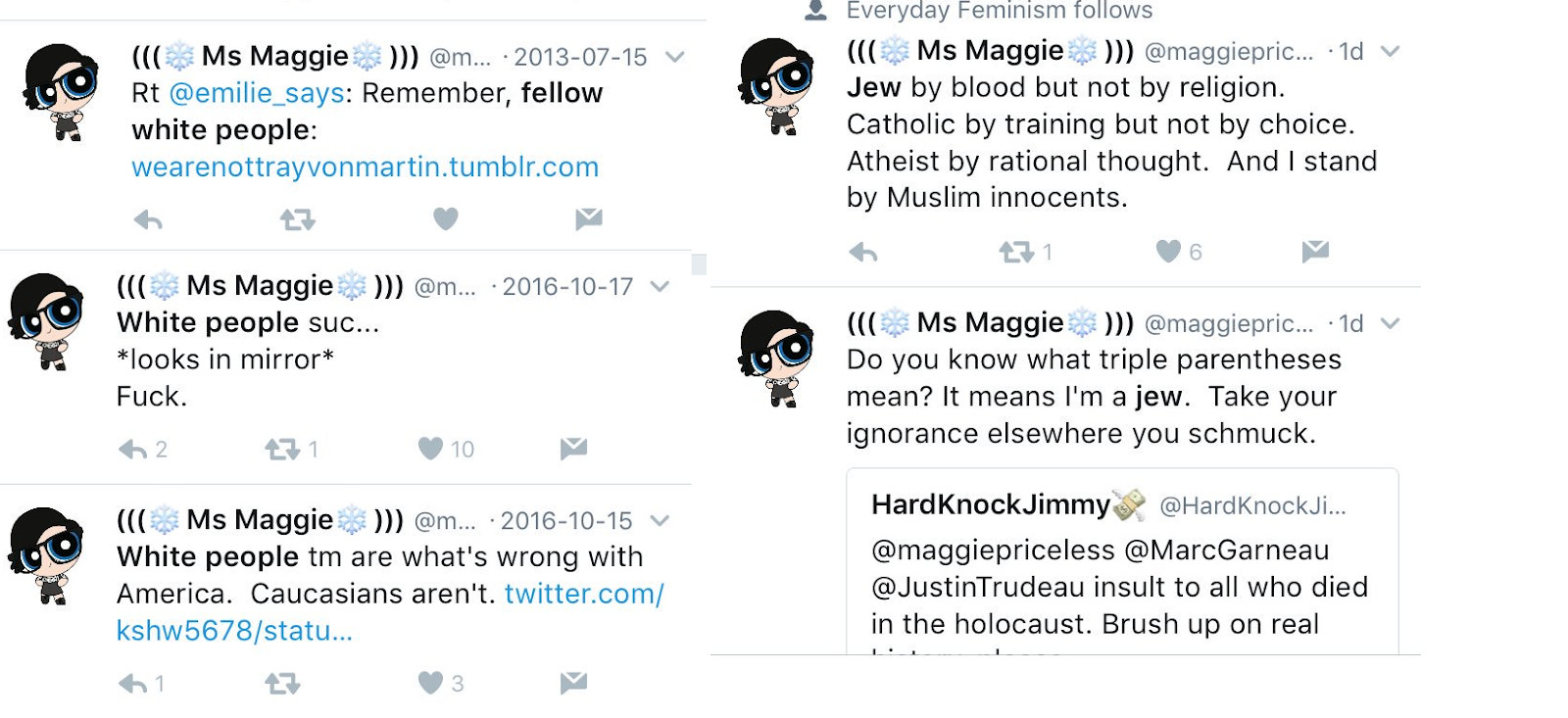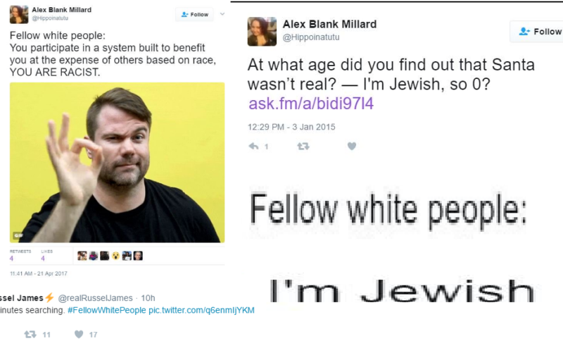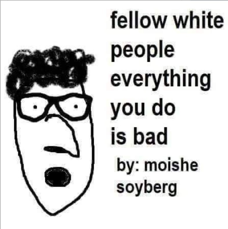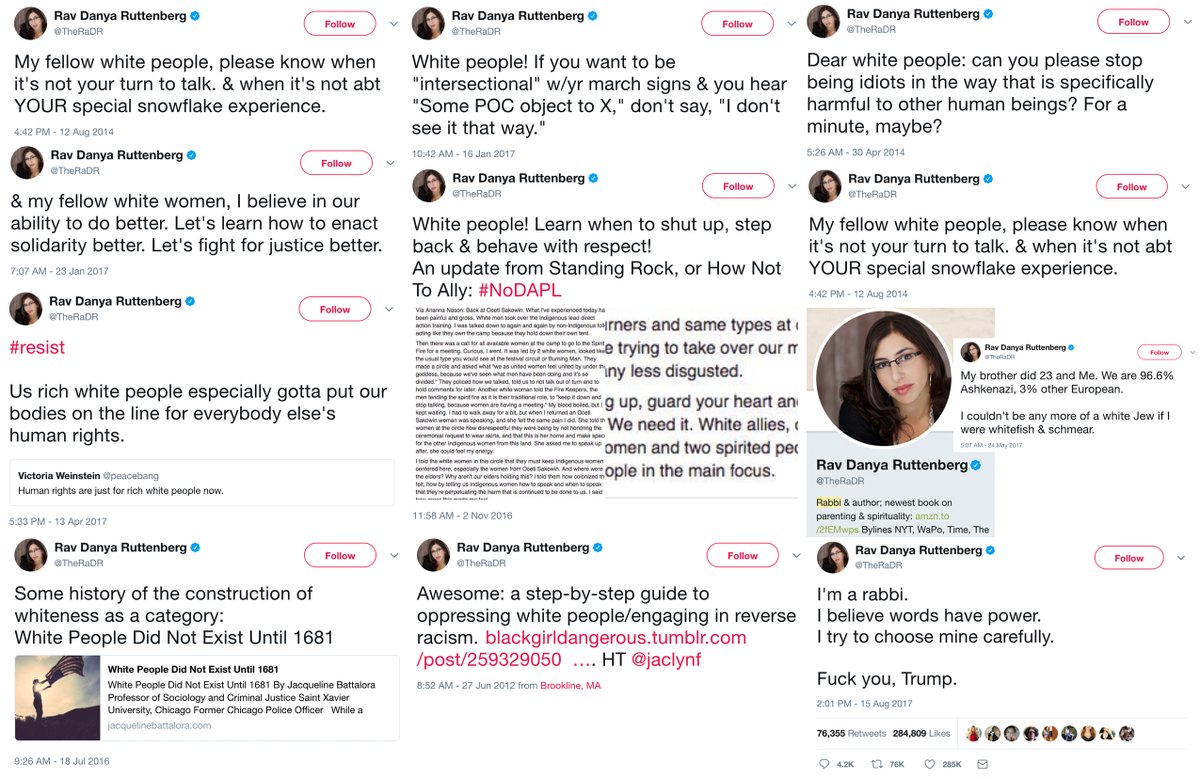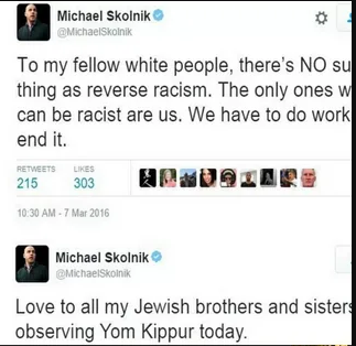 Doar folosește aceste expresii “dragi albi, noi albii privilegiați” în conversație. Apoi atacă albii, rasismul, folosește expresiile “sclavie”, “homosexualitate”, “antisemitism”, “6 milioane”.