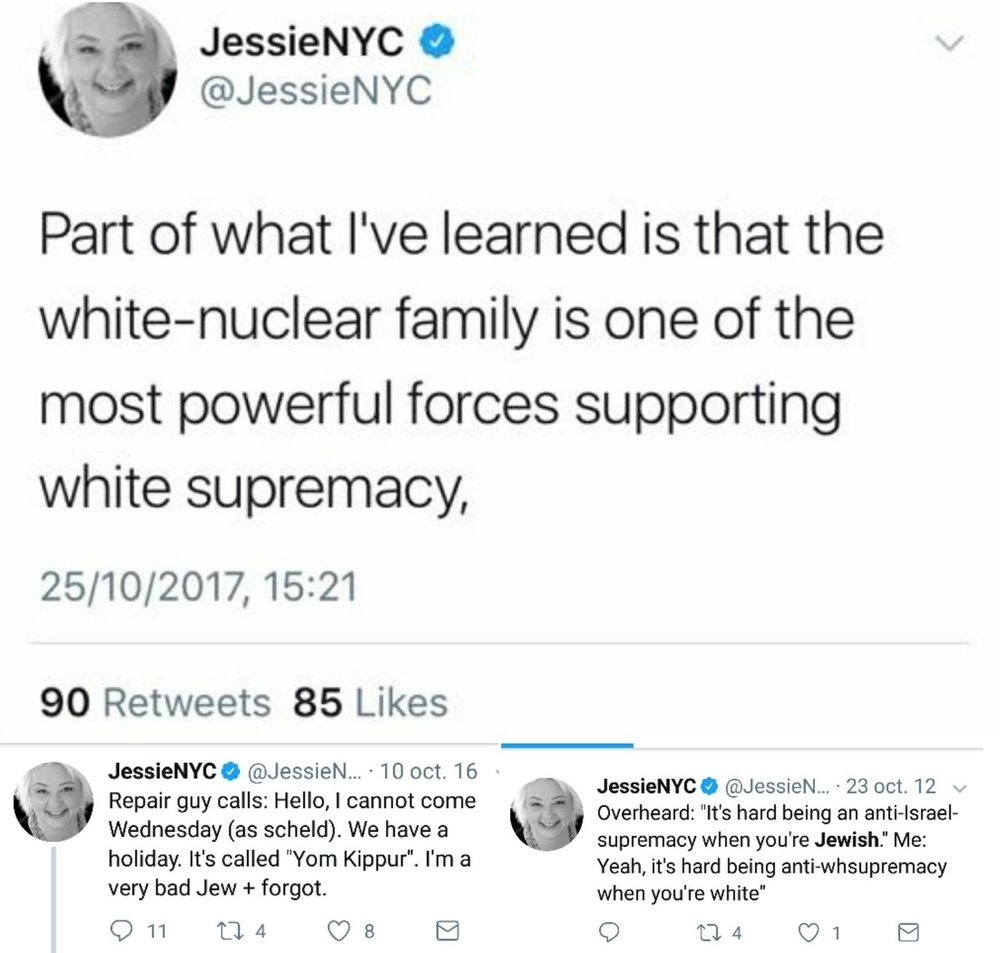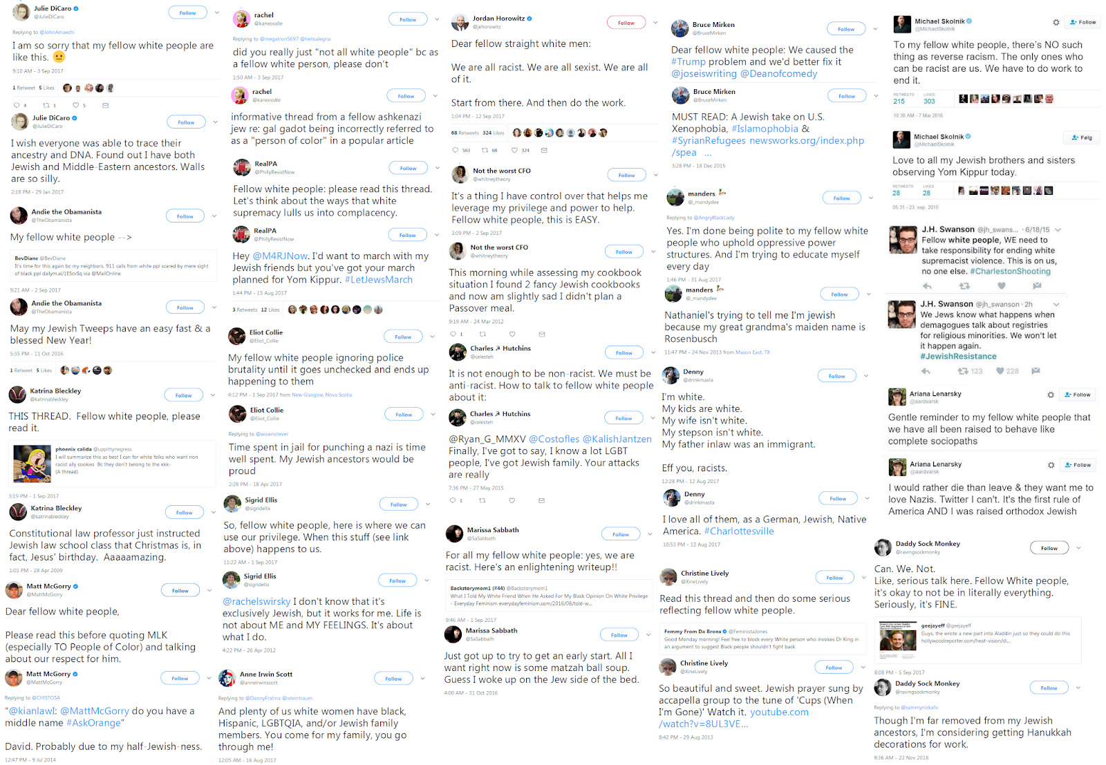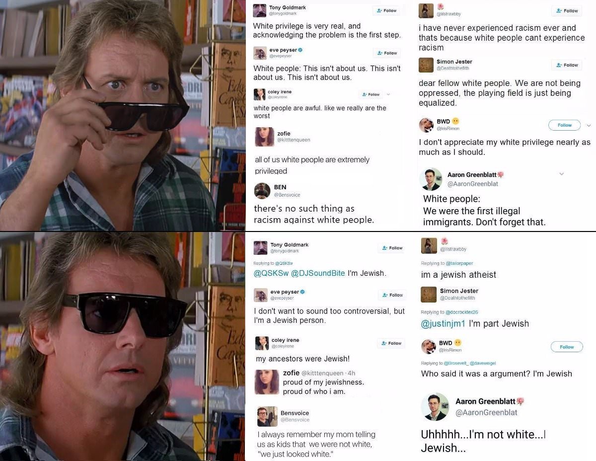 Când cineva îi critică sau îi atacă , redevin ca prin magie evrei și pozează în victime. Uneori folosesc sintagma: “I’m not white, I’m Jewish” – “nu sunt alb, sunt evreu”.
