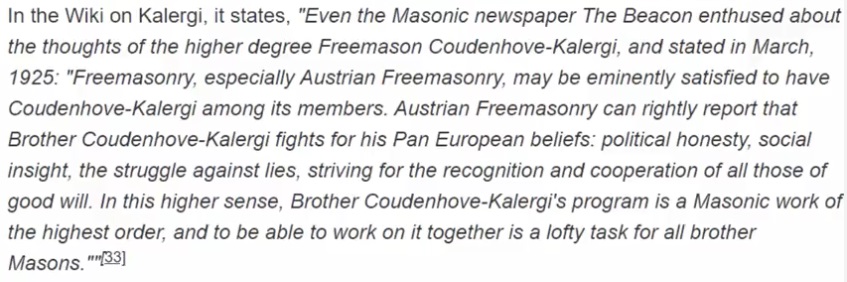 “Masoneria, în special masoneria austriacă, este extrem de satisfacută să îl aibă pe Kalergi ca memberu. Masoneria austriacă poate să raporteze justificat că fratele Coudenhove-Kalergi luptă pentru crezurile sale Pan Europene: onestitate politică, perspectiva socială, lupta împotriva minciunii, tânjind după recunoașterea și cooperarea tuturor celor cu intenții bune. În acest sens, programul fratelui Coudenhove-Kalergi este o lucrare masonică de cel mai înalt nivel, și să lucrăm împreună la ea este o sarcină importantă a tuturor fraților masoni.”