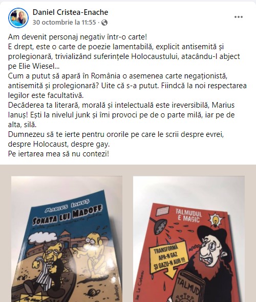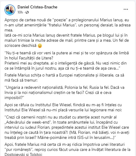 Daniel Cristea-Enache, cronicarul de la “Realitatea Evreiască” și U.U.S.R. îl atacă pe Marius în postările de pe pagina sa de facebook. Autorul sonatei i-a spus tot ce a avut de spus în articolul său, Scrisoare deschisă unui cronicar-tonomat.