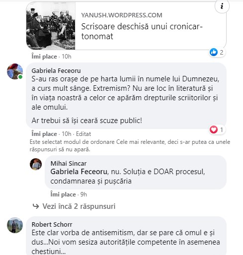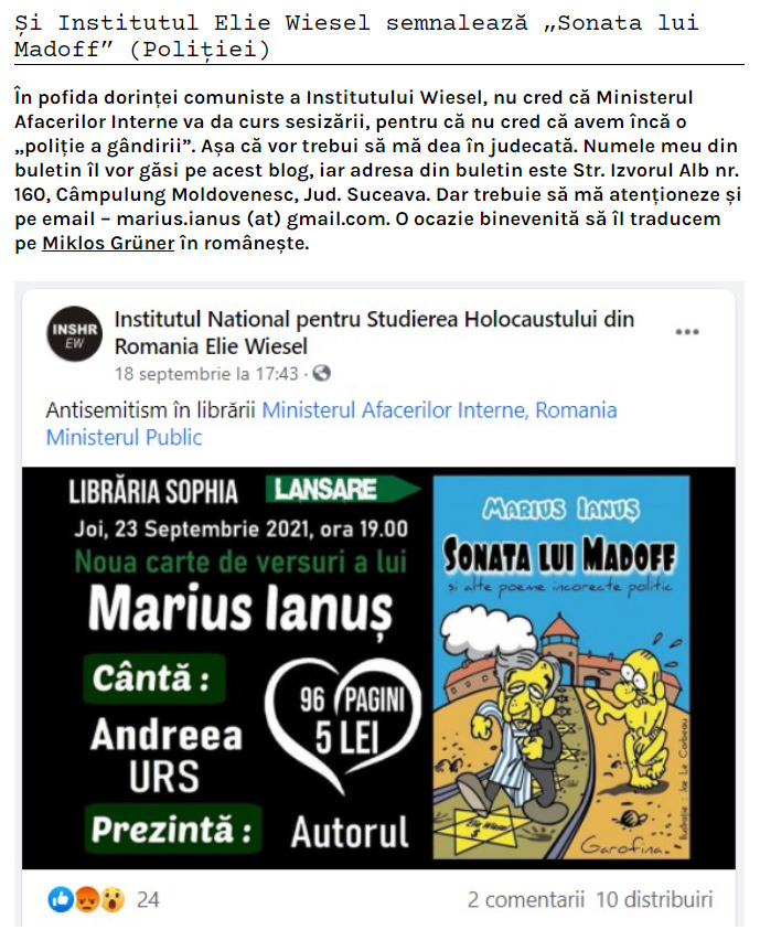 Aveți mai jos o mică discuție de pe Facebook (cu poze) și o alta aici – https://yanush.wordpress.com/2021/10/04/institutul-elie-wiesel-protesteaza-impotriva-sonatei-lui-madoff/