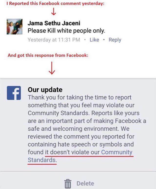 Lucruri similare sunt semnalate şi din alte ţări, un mesaj care instiga la uciderea „albilor”este semnalat de utilizatori către FaceBook ca fiind inadecvat iar FaceBook răspunde că nu încalcă standardele comunităţii. Acestea sunt doar o mică parte din problemele create de neinspirata folosire a conceptului de „ură” care este extrem de interpretabil.