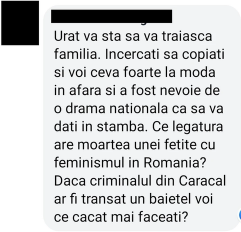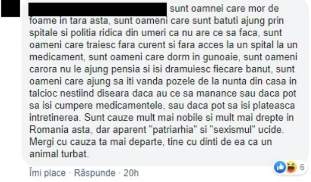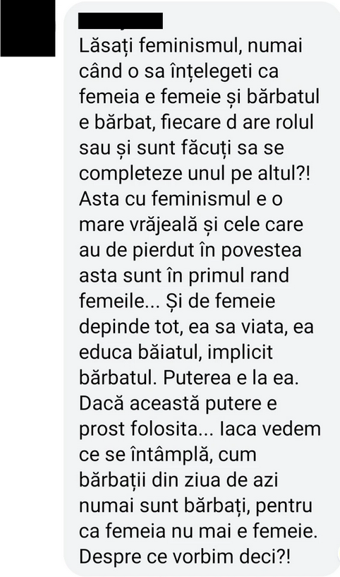 Sunt multe probleme de schimbat în țara asta, mult mai nobile decât sexismul. De parcă existența unor chestii grave le anulează pe celelalte. Oamenii nu înțeleg că, dacă nu urlă că ceva e rău, nu se schimbă nimic. Poate dacă băiatul care a zis asta muncea oleacă pentru problemele pe care le enumeră, în loc să comenteze pe net, România ar fi fost un loc mai bun.