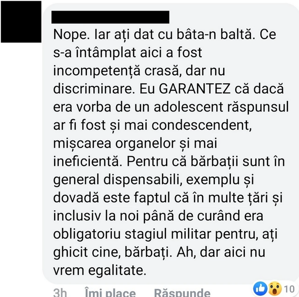 Evitând fondul problemei, revine la obsesia față de ‘sexism’ și în final autorearea ajunge să reproșeze faptul că cel care a lăsat comentariul nu a făcut nimic înafara comentariilor de pe net.