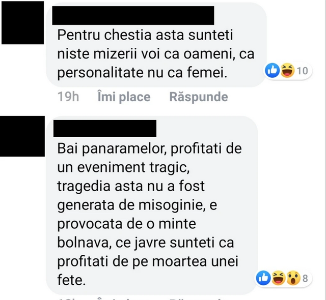 Urmând modelul occidental, activistele s-au maimuțărit în public cu lozinci precum “Patriarhatul Ucide”, iar publicația neomarxistă Vice a publicat un articol în care răspunde argumentelor scrise de oameni indignați de faptul că Vice se folosește de o tragedie de anvergură natională în scop ideologic.