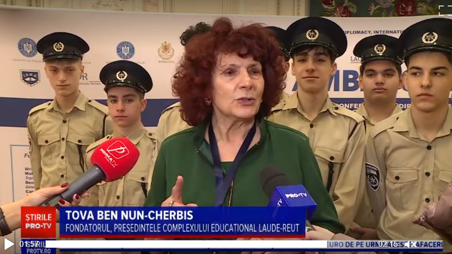 Tova Ben Nun-Cherbis, fondator și președinte al Complexului Educațional Laude-Reut: „Ei au făcut internshipuri la 20 de ambasade. La ambasadele unde ei s-au dus să facă intershipuri, fiecare și-a ales un lider care joacă rolul ambasadorului țării și noi am legat acest congres de diplomație cu istorie, istoria Holocaustului, istoria celui de-al Doilea Război Mondial.”