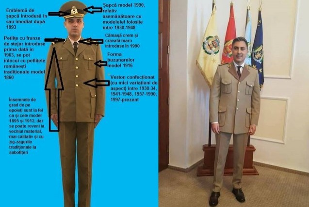 Uniforma mozaic, de instrucție și campanie să se schimbe, să se adapteze nevoilor (așa a fost mereu), dar cea de oraș și serviciu trebuie să păstreze elemente tradiționale. Mai bine ar introduce la actualul veston de oraș petlița săgeată, de la soldat la colonel, simbol ce a fost purtat în războaiele de independență, primul și al doilea mondial. E o rușine să porți însemne pe care le-au purtat bunicii, străbunicii și străbunii noștri? Asta era ultima problemă a Armatei Române – are tehnică de luptă și auto nouă, uniformele de instrucție sunt cele mai bune, tot personalul se ridică la cele mai înalte standarde și uite că doar uniforma de oraș trage în jos cu 100 de ani armata, stopându-i drumul către viitorul luminos … Ne reîntoarcem în perioada 1952-1957, când, în afara unor semne de armă, ca infanteria, nimic din uniformă nu mai era românesc, ci de influență sovietică. Mai rămân tradiționale doar însemnele de grad ale subofițerilor și ofițerilor. Să le schimbați și pe ălea, distrugători ai memoriei eroilor noștri!”